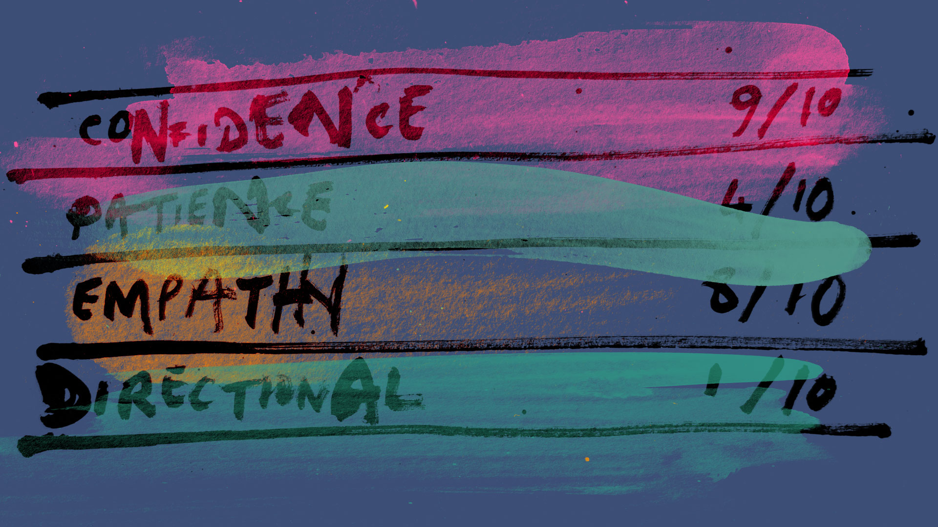 If we’re to get into the Jungian psychology of all this – basically the assimilation of the conscious and unconscious dark and light within as a basis for good mental health – then there’s a lot of further reading to be done. But in my case I recognised that while my irritating clumsiness, perhaps a negative tendency, might score 2/10 owing to its impact in the home, it is in fact the foundation of my natural drawing style – a key part of my identity as an illustrator, a frenetic, chaotic image-making style that has won me clients including The New York Times, EMI, Channel 4 and The Premier League. Not bad for a 2/10 trait.