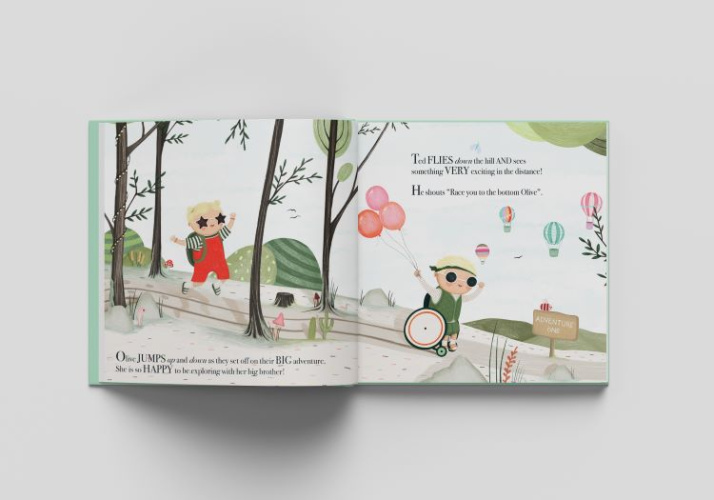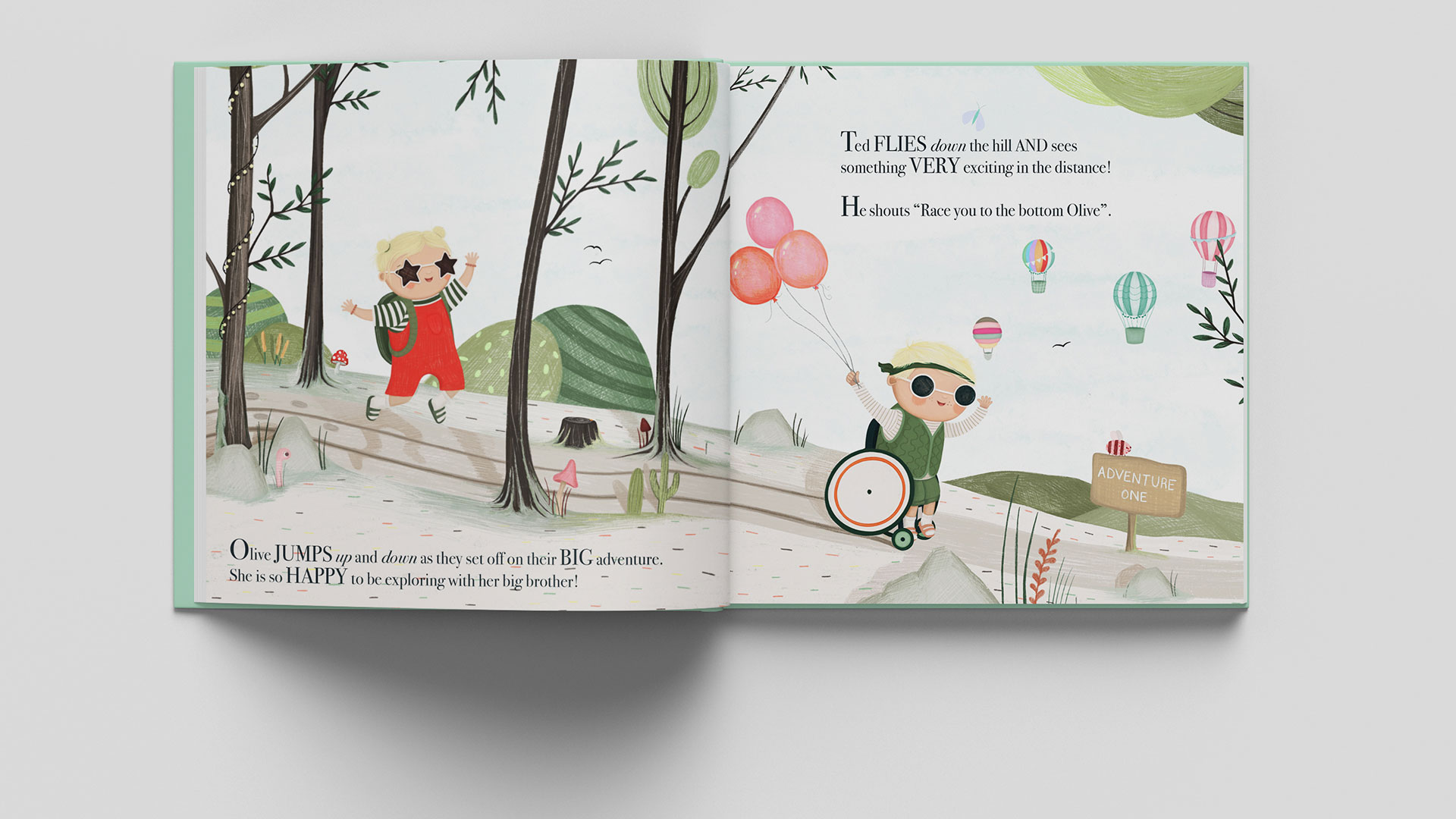 Olivia Hughes: My idea for Ted and Olive’s Great Adventures began during my foundation year, where I started to explore the concept of a children’s book based on myself and my brother Edward. Fast forward to my final year at the University of Leeds, I decided to take on the challenge of developing this concept and formed the following brief for myself: design a project that celebrates disability visibility for early years readers.