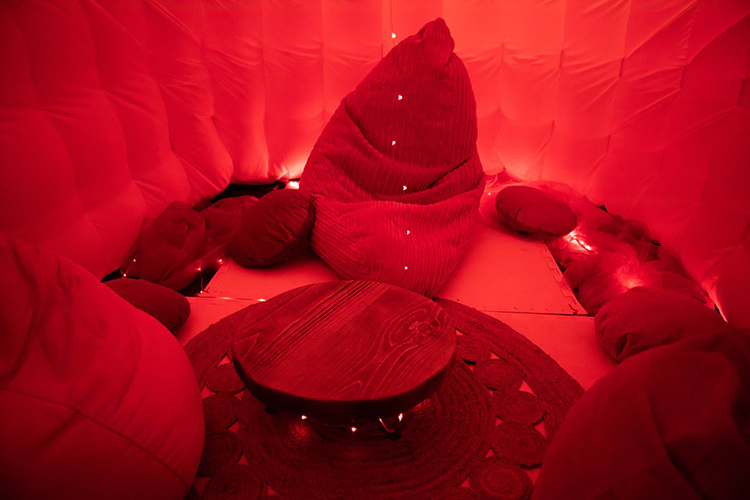 The design of the tent itself was deliberately kept similar to the virtual starting space in terms of furnishings and aesthetics in order to assist orientation. “It’s all meant to be like a womb, but it also has to be a welcoming space, so there’s fairy lights and soft furniture on the inside,” says Baker.
