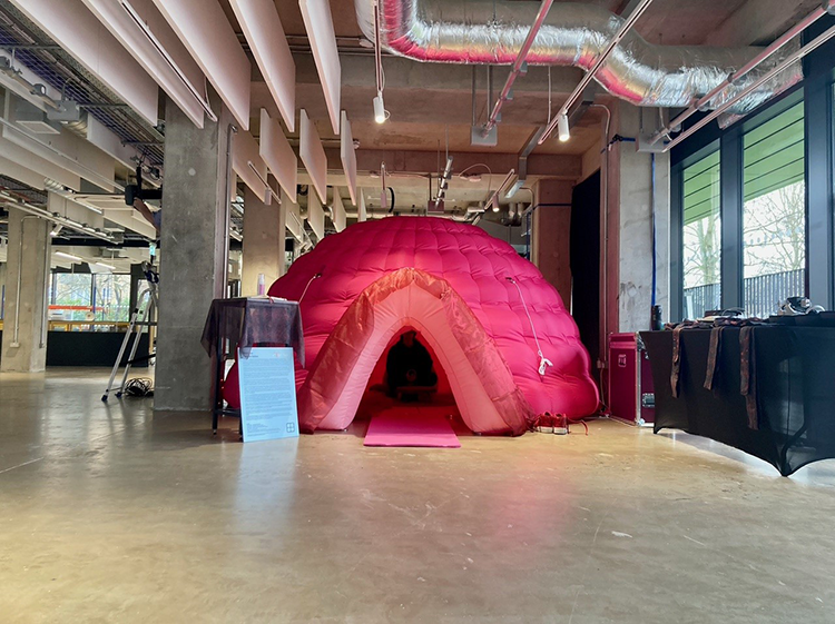 INTER/her uses a bespoke physical dome tent space created from bouncy castle-like materials to form an “inside-out sensory and emotional experience”. Visitors are first fitted with a wearable haptic garment and VR headset (the designers opted to use the Android-based Oculus Quest 2 headset) before crawling through the “vaginal-style” tent opening.