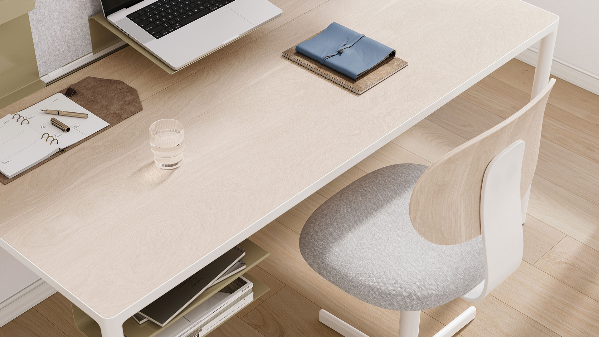 Koru considers the planet by encouraging “reuse of furniture and recovery of materials in order to reduce waste”, says Elkington, explaining how Studio Elk selected “hard-wearing and home sensitive” materials, suitable for a closed-loop system. Desk and chair frames, as well as accessories, are made from recycled aluminium while the desktop is made from plywood and the backboard and feet pads are made from recycled felt.