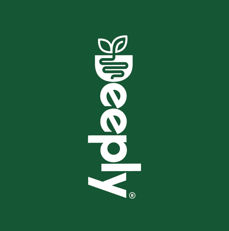 A nourish bowl icon sits atop Deeply’s bespoke, hand-drawn wordmark, designed to demonstrate plant-based ingredients entering the gut.