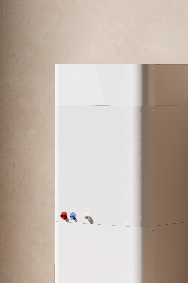 Four products make up the Electric Air system – the air handler, condenser, thermostat and wall-mounted split A/C – as well as the corresponding app. In comparison to UK systems, the air handler is like a boiler, but it just deals with heating and cooling, not water.