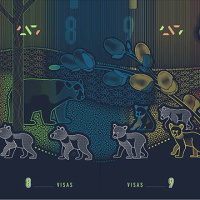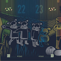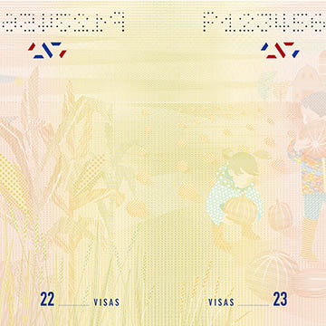 In a pale red and yellow Autumn scene on the visa pages, children can be seen holding pumpkins in a field. A mother bear and her cubs are depicted in the spring scene on a faded blue and green background.