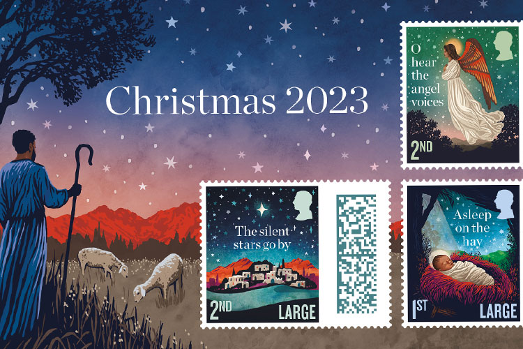 Each stamp features lyrics from a well-known Christmas carol and was created with watercolour to add “depth and richness”.