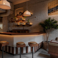 The seating comprises simple geometric bar stools, booth seating with warm light brown heritage leather upholstery and limestone travertine inlaid tables. A-nrd Studio designed a minimalist back bar with bespoke shelving, which is decorated with authentic Thai ceramics and greenery. The oak used to make all of the restaurants custom furniture and fixtures at Kolae is hand-planed, a traditional technique chosen by A-nrd to add texture and character to the wood. The studio worked with skilled joiners in the north of England on the pieces.