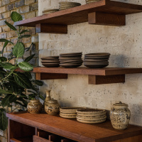 Upon entering, visitors walk over a cement floor and are surrounded by exposed brickwork and warm-toned limewashed plaster walls. The space features a custom open-kitchen counter and cocktail bar made from textured clay plaster with a dark oak countertop, adding an element of theatre for diners. Its “stilted skirted base” takes its cues from “the traditional stilt house culture seen across North-western Thai architecture”, according to the studio. This motif features subtly across the base of all A-nrd Studio’s bespoke furniture for Kolae.