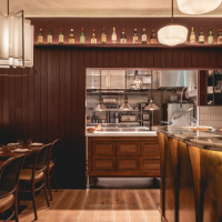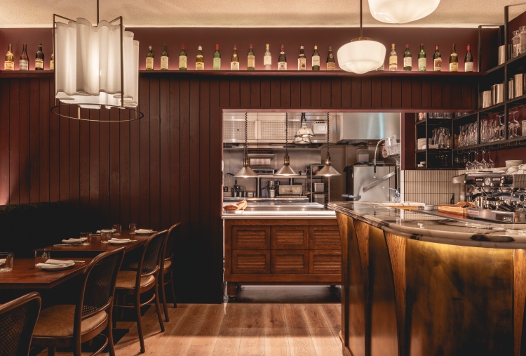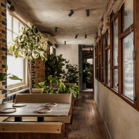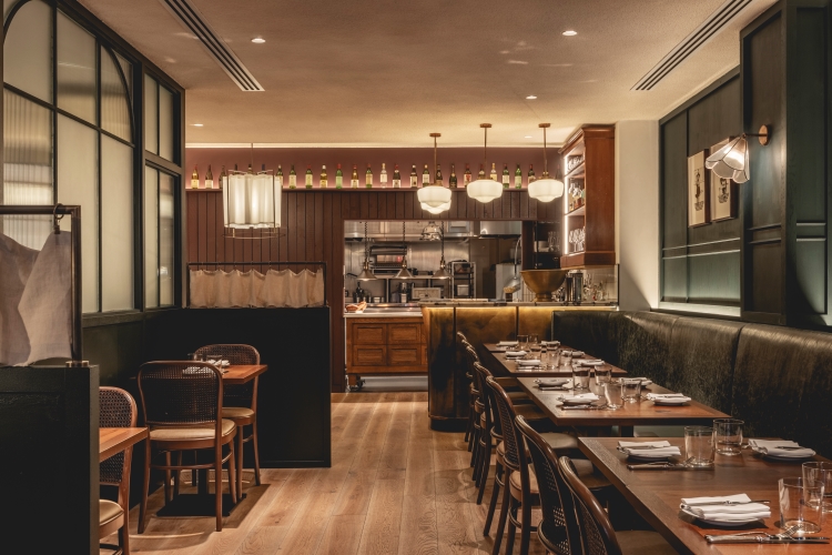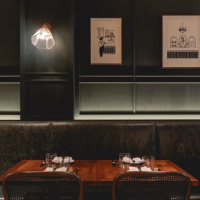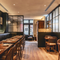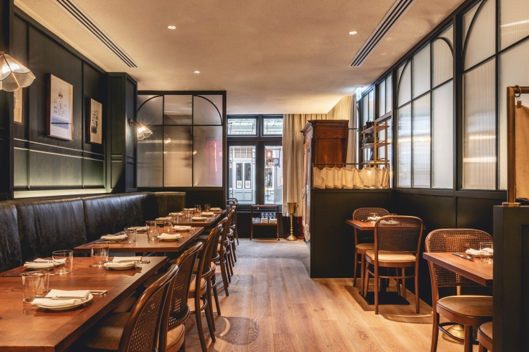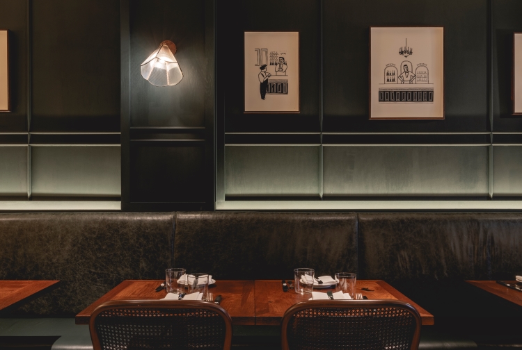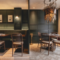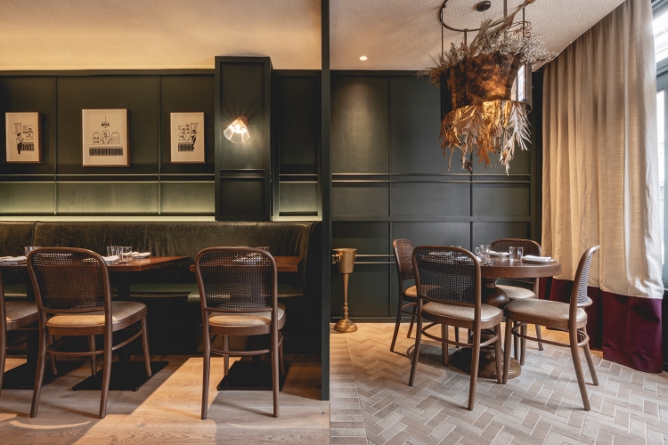 Glazed screen is used in the entrance lobby, to minimise disruption for diners, as well as brick flooring that continues into the semi-private dining area at the front of the restaurant. Stained light oak flooring is introduced in the main dining area, which also features walls clad in deep green-stained timber panelling and a large green leather banquette, running the length of the restaurant. Rustic timber tables and bistro-style chairs have been included to retain a “relaxed feel”, according to the studio.