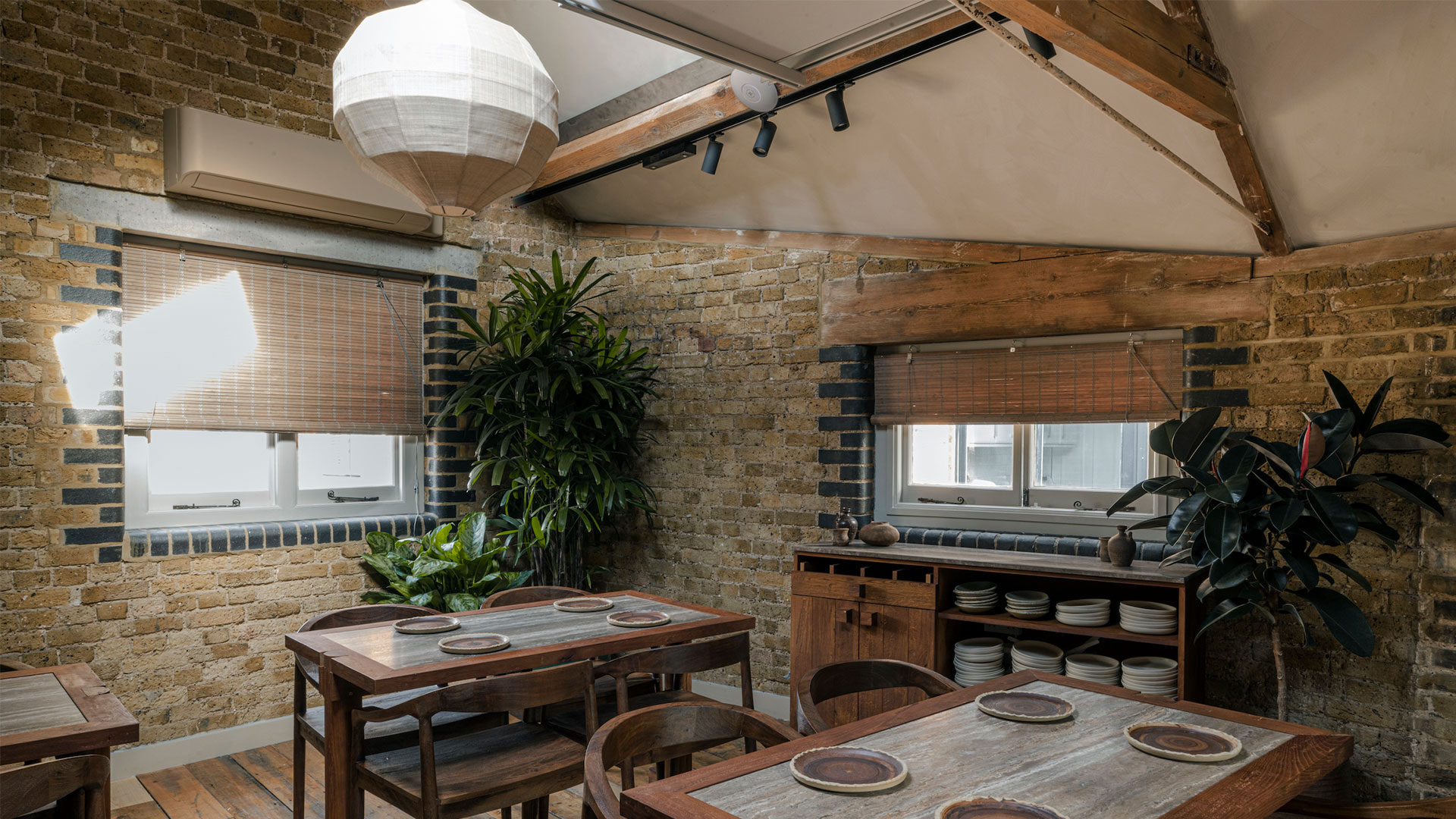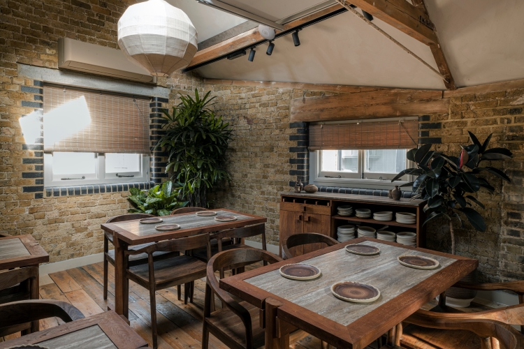 Bespoke light fittings designed by Studio Found are used throughout to define spaces, and a selection of pieces by dried flower artist Design By Nature, including one which emerges from the feature light at the front of the restaurant, punctuate the restaurant. Linen curtains were hung to shield diners from street views and “create a feel of stepping away from the busy London high street”, says Studio Found.