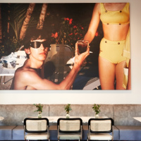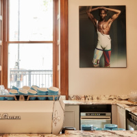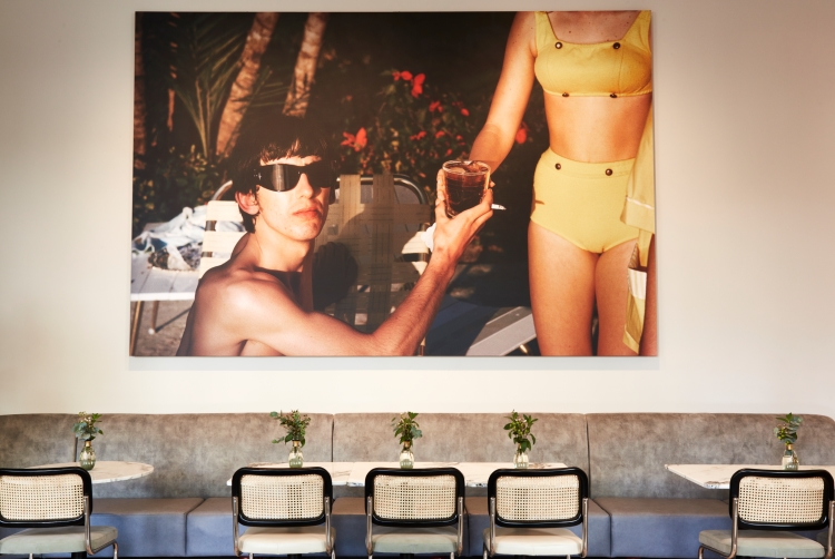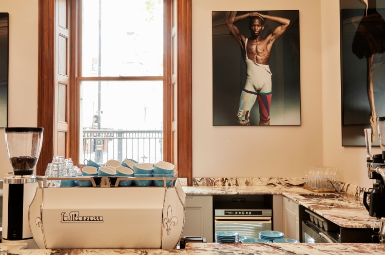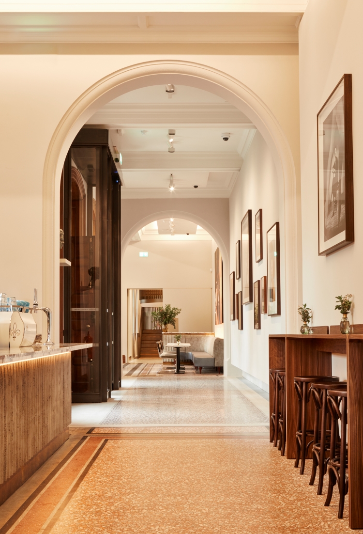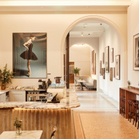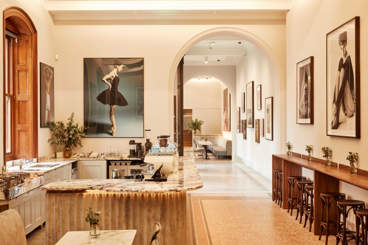 Restored original architectural features, including a mosaic floor and original shutters around picture windows, work alongside new elements like the veined marble counter and soft, concrete fluting of the café’s statement coffee bar. Run for the Hills selected “bold, modern artworks” that celebrate “leading lights in the world of ballet” for the café.