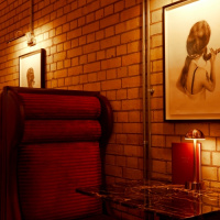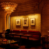A brass, walnut and marble bar with an antique cabinet back bar display sits at the rear of the restaurant. In the basement is a private dining room with deep burgundy panelled walls decorated with a dried flower wall sculpture at the head of the table.