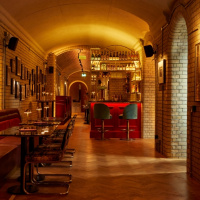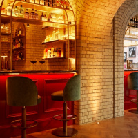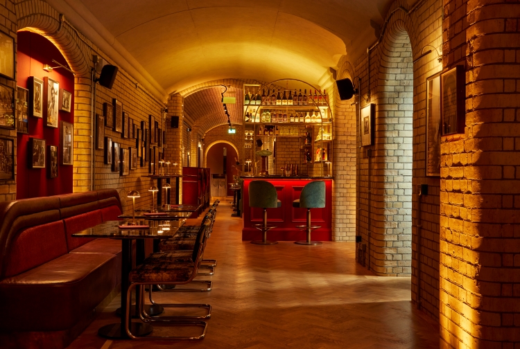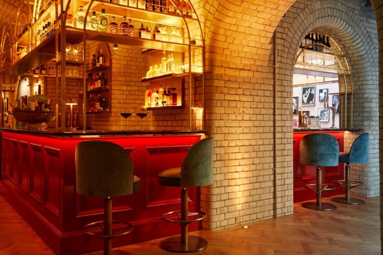 Down in the fully refurbished lower-ground vaults is Larry’s Bar, designed to be “a cosy space” with its warm lighting placed to highlight the brick arches. The bar was designed to fit unobtrusively into the vaults, with one side tucked into the vault arches and the other sitting beneath the glazed ceiling that offers views to the street level above.