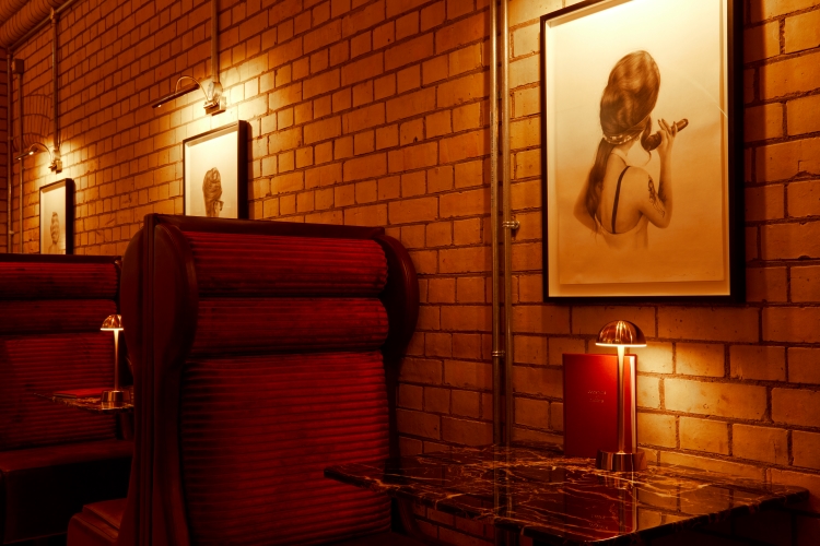 Run For The Hills also designed tone-on-tone and “colour-clash” pink and red booth seating. Between the curved, tiered deep oxblood booths are a mix of marble and timber-edged stone tables in white Carrera marble and natural Emperador brown marble. Cocktail tub chairs and upholstered stools clad with vintage velvets, leathers and textural weaves and fitted seating with Deco-curved, tiered back-rests accent the space and continue the sultry colour palette.