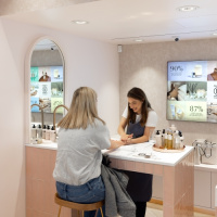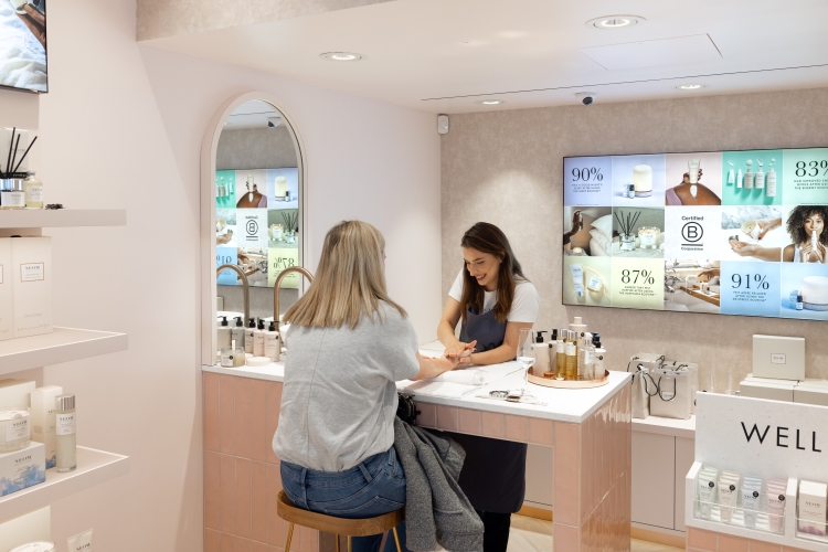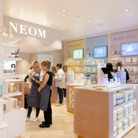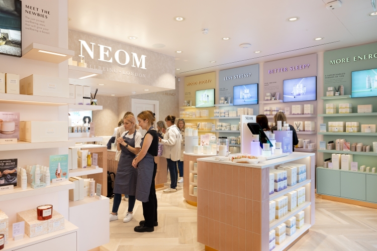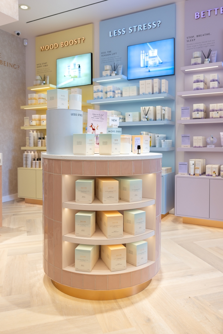 NEOM’s signature brand colour is blush pink, which also features in the space, along with a heritage light herringbone timber floor. Rose gold finishes throughout the signage system accent the interiors and look to ensure clear communication while adding “a touch of sophistication to the overall aesthetic”, says Zebra.