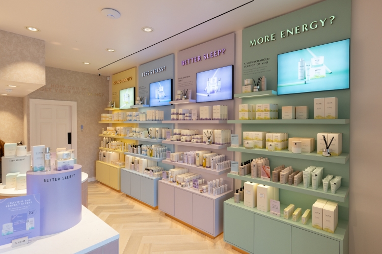 Following the success of British home fragrance and beauty brand NEOM’s pop-up space in Bicester Village, the brand has announced its opening of the permanent Wellbeing Hub in Bicester designed by retail design studio Zebra. Each of NEOM’s wellbeing ranges is distinguished by its colour palette, which could include shades of violet, blue, yellow, and greens. Taking cues from the product line’s colour palette, Zebra applied colour strategically across the interiors, helping customers to navigate the space and easily find the range they’re looking for.