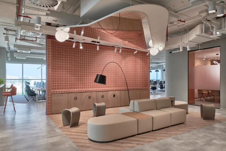 A colour palette of terracotta, muted blue, saturated green and grey was chosen to echo Sprinklr’s brand colours. Tactile materials such as tiles and felt seek to create “a visually captivating atmosphere that embodies the essence of the company’s corporate identity”, according to Roar.