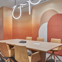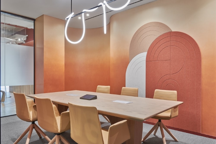 The studio says it took a “dual approach”, reflected through a series of “innovative features”, from the customised suspended ceiling with mirrored acrylic stickers and spherical lighting, to the use of Interface carpet, patterned acoustic panels, and curved furniture pieces. Roar also designed distinct zones into the space, differentiated by design elements, colour palettes and furniture styles.